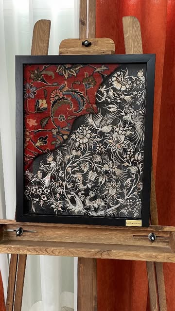 ترکیب مس و فرش دستبافت همراه با قاب نفیس.